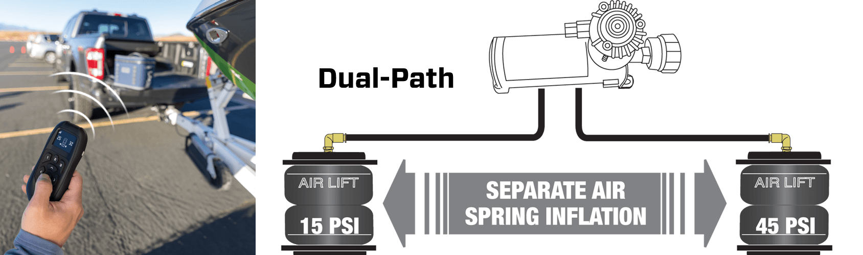 Dual-path systems allow each air spring to be inflated or deflated individually, independent of one another. This allows you to set your air springs to different pressures depending on the needs of the load you are hauling.