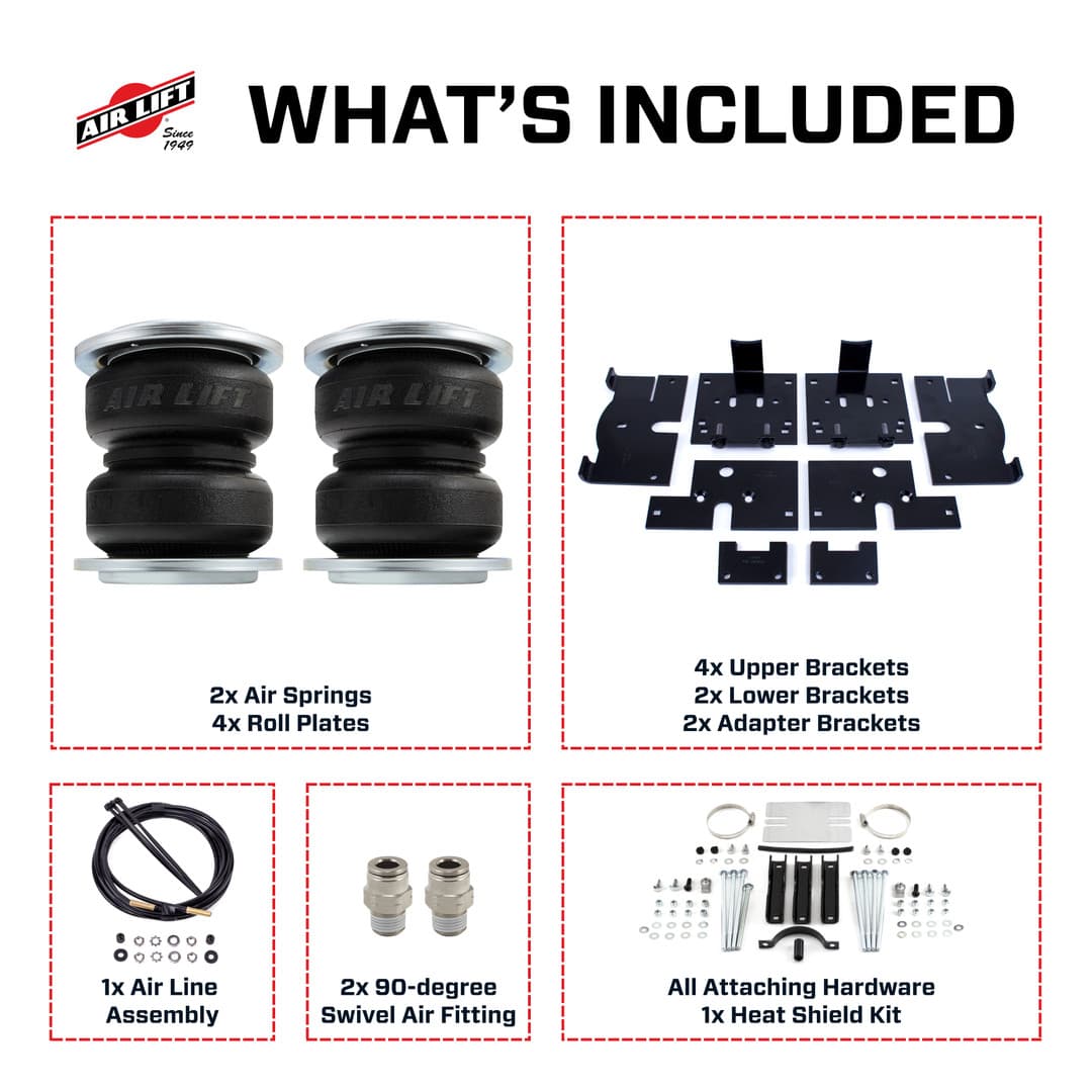 The Air Lift ProSeries kit helps to eliminate problems frequently faced when towing and hauling, such as squat, trailer sway, body roll, and bottoming out. With the added stability and weight distribution that air springs provide, you can haul safely with optimal braking and steering control.