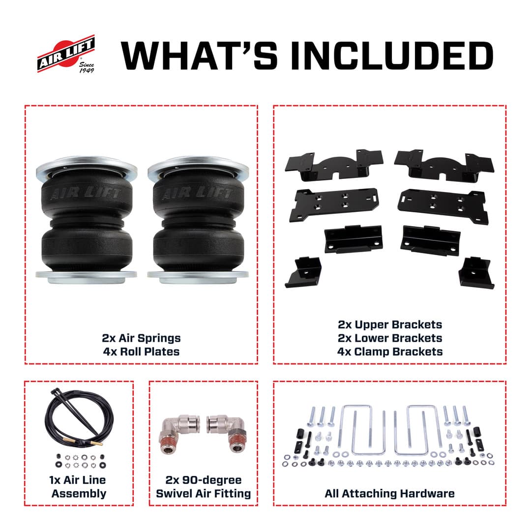 The Air Lift ProSeries kit helps to eliminate problems frequently faced when towing and hauling, such as squat, trailer sway, body roll, and bottoming out. With the added stability and weight distribution that air springs provide, you can haul safely with optimal braking and steering control.