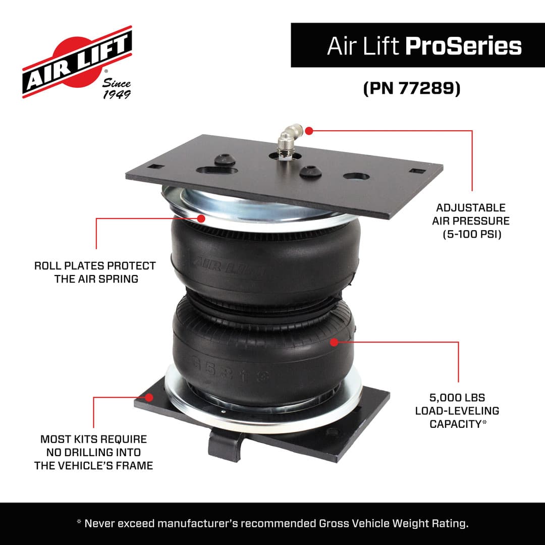 The Air Lift ProSeries kit helps to eliminate problems frequently faced when towing and hauling, such as squat, trailer sway, body roll, and bottoming out. With the added stability and weight distribution that air springs provide, you can haul safely with optimal braking and steering control.