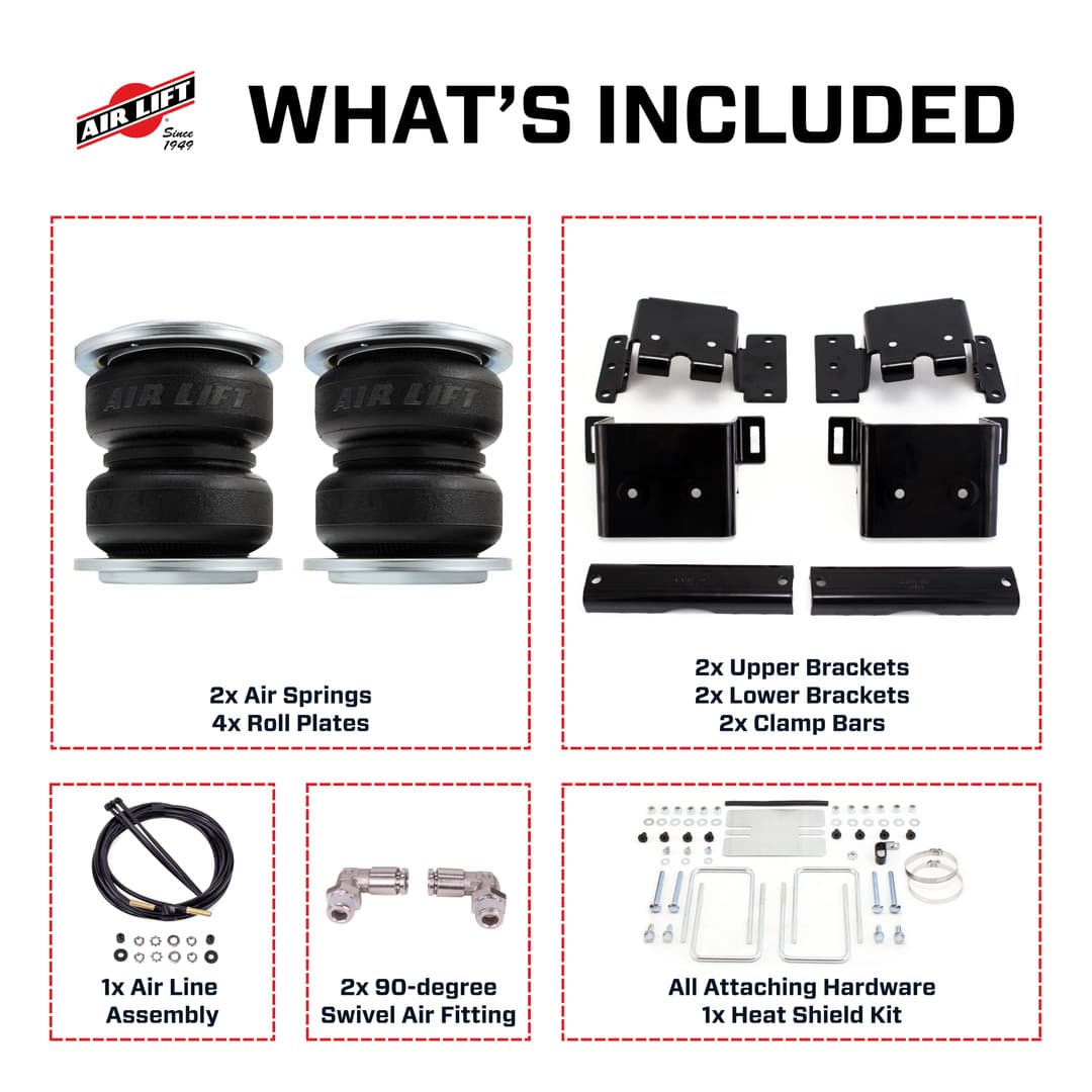 The Air Lift ProSeries kit helps to eliminate problems frequently faced when towing and hauling, such as squat, trailer sway, body roll, and bottoming out. With the added stability and weight distribution that air springs provide, you can haul safely with optimal braking and steering control.