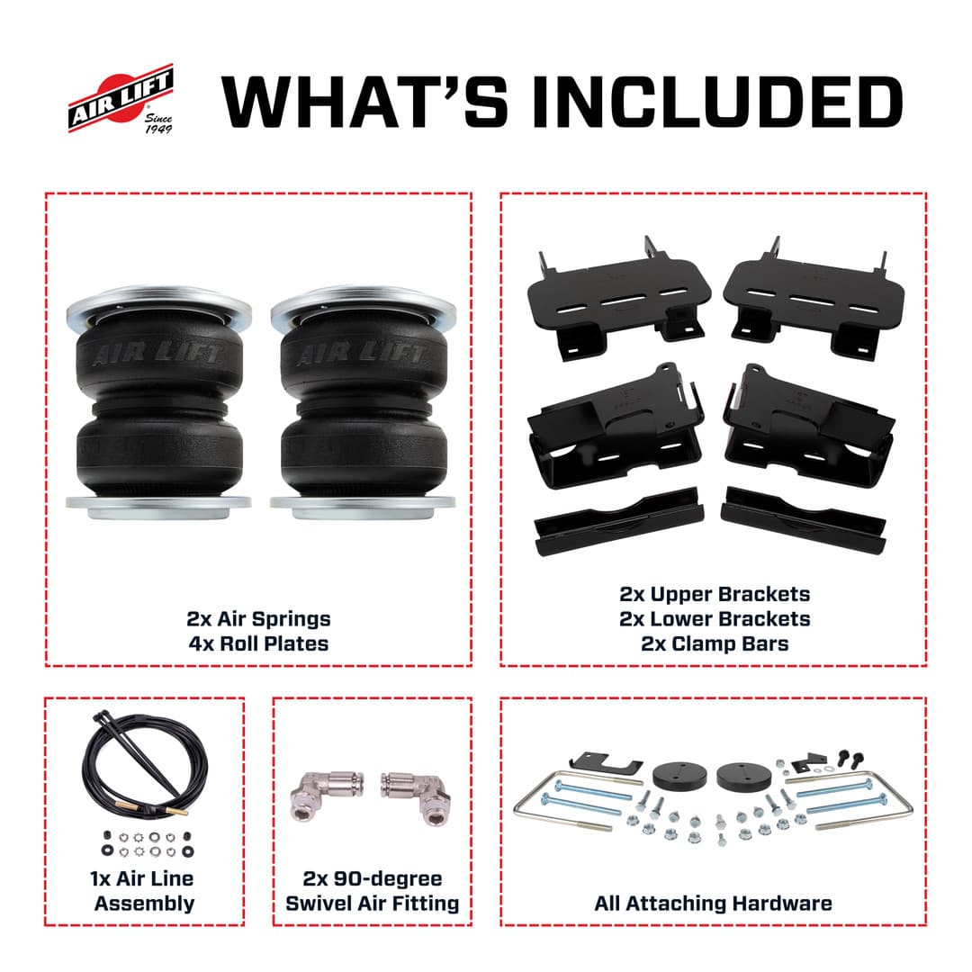 The Air Lift ProSeries kit helps to eliminate problems frequently faced when towing and hauling, such as squat, trailer sway, body roll, and bottoming out. With the added stability and weight distribution that air springs provide, you can haul safely with optimal braking and steering control.