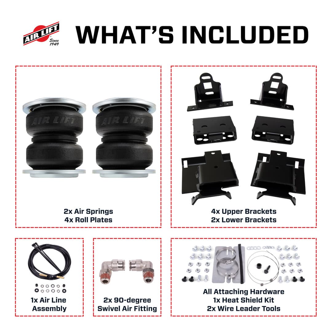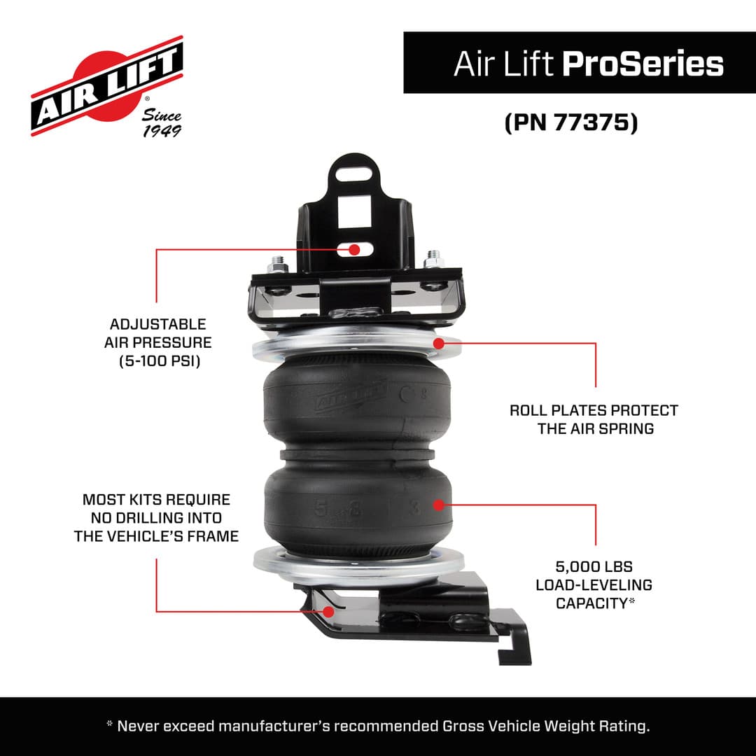 The Air Lift ProSeries kit helps to eliminate problems frequently faced when towing and hauling, such as squat, trailer sway, body roll, and bottoming out. With the added stability and weight distribution that air springs provide, you can haul safely with optimal braking and steering control.